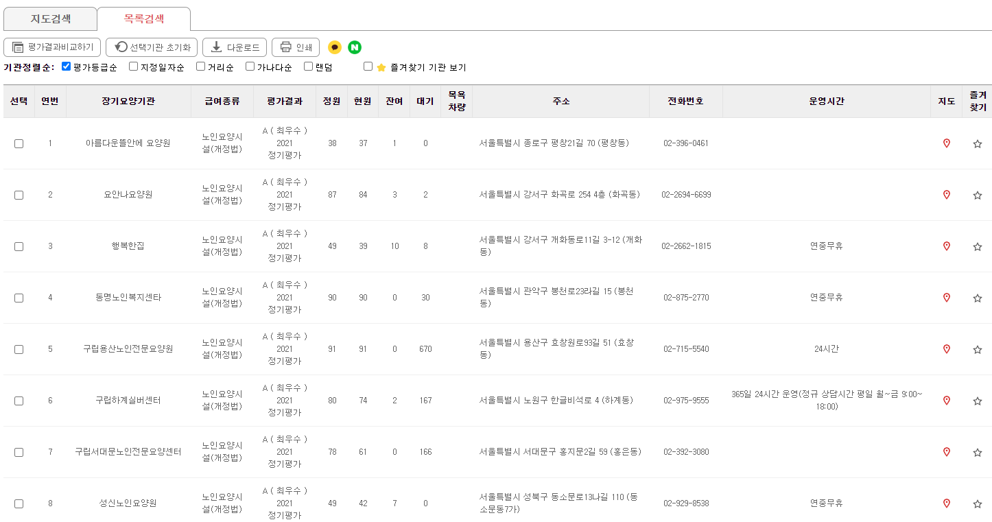 저는 서울특별시, 전체, 노인요양시설(전체), 정원( 30~100명)을 선택해 보았습니다.