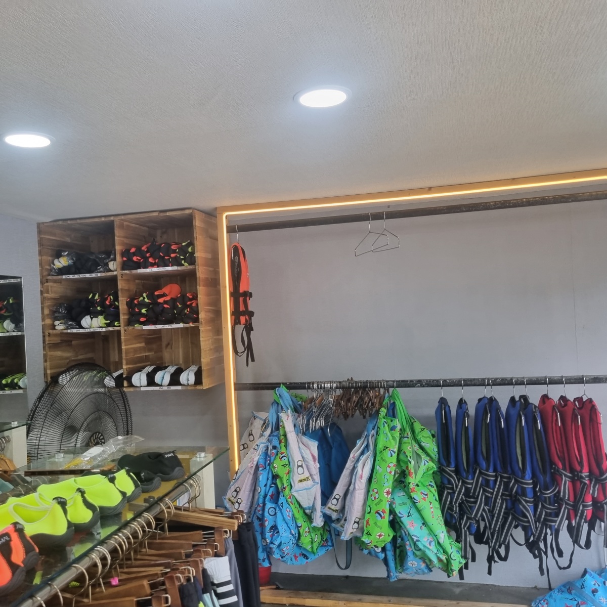 다양한 아쿠아슈즈, 구명조끼, 바지등이