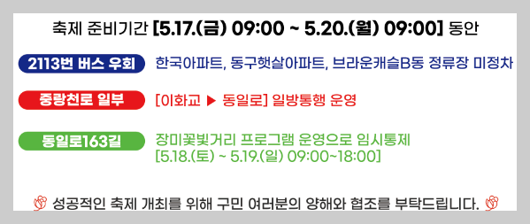- 중랑 서울 장미 축제는 주차공간이 협소하므로 대중교통을 이용해 주세요.