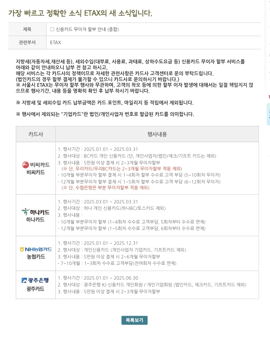 지방세(자동차세, 지방세) 납부 무이자 행사 카드 안내(-25.3.31)