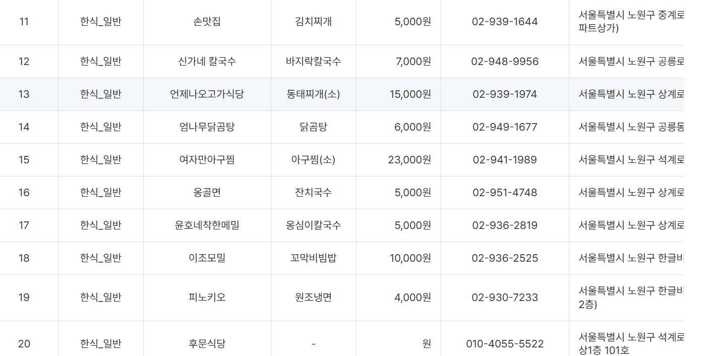 예를 들어, 노원 옹골국수(6,000원), 김가네국수집 (도봉로153길 51) 칼국수 5,500원!, 행촌 (우이천로34길 10) 청국장 8,000원! 가성비 좋은 식당, 미용실, 학원 등 다양한 업종이 포함되어 있으니 꼭 확인해 보세요.