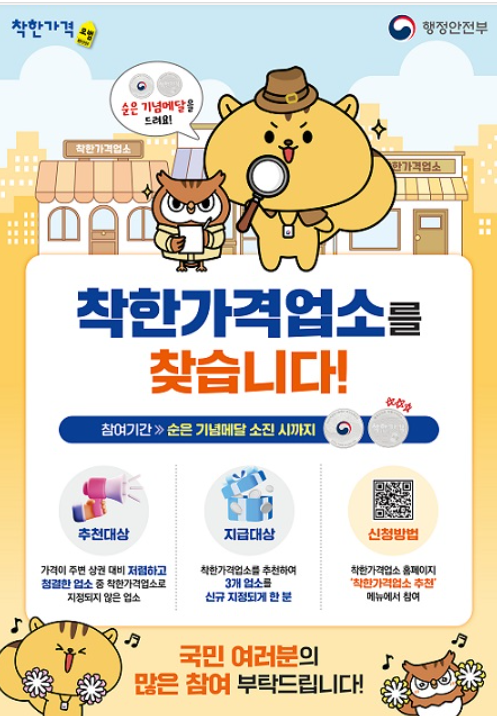 행정안전부는 착한가격업소를 국민들이 직접 발굴할 수 있도록 대국민 공모를 운영 중이에요!
