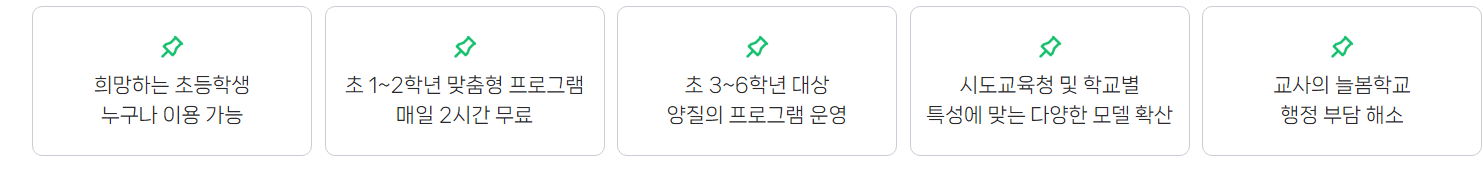 늘봄학교란 정규수업 외에 학교와 지역사회의 다양한 교육지원을 연계하여 학생 성장 및 발달을 위해서 제공한 종합 교육프로그램인데요