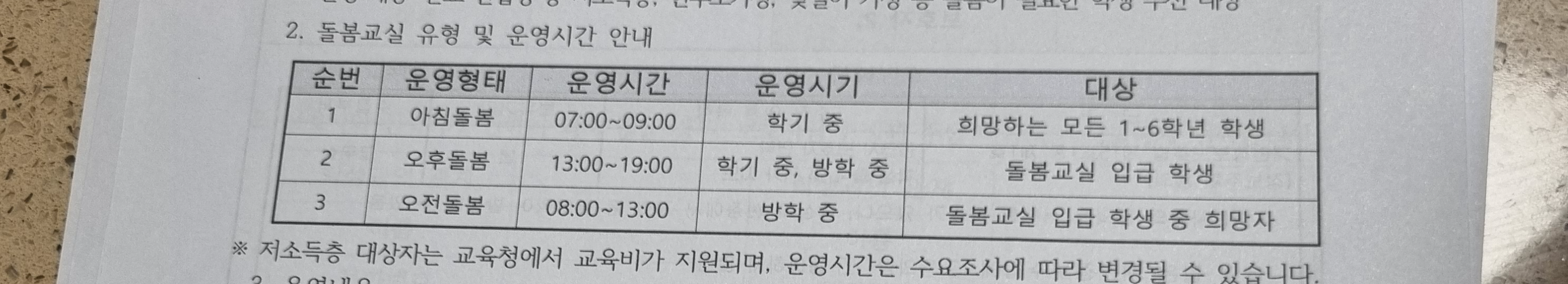 1) 돌봄교실 유형 및 운영시간 안내