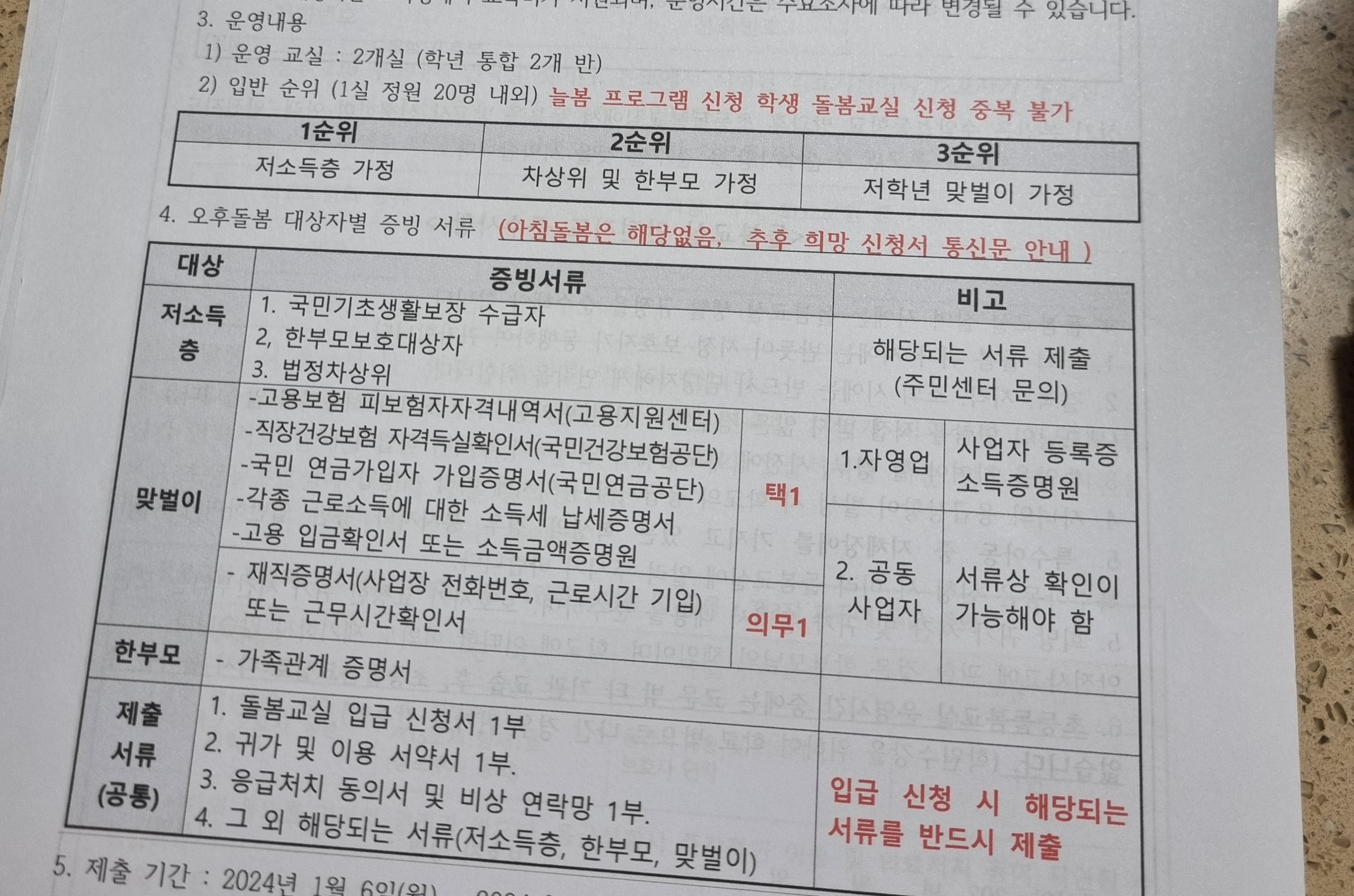 2) 오후 돌봄 대상별 증빙서류