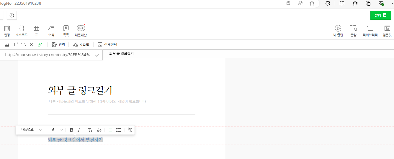 저는 '외부 글 링크 걸기'라는 제목으로 '외부 글 링크걸어서 연결하기'로 글을 쓰고 만들어 보겠습니다.