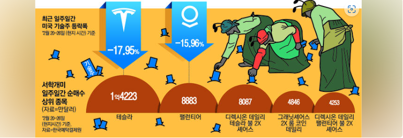 요즘 미국 기술주가 최근 일주일간 하락세를 보이는 가운데, 국내 투자자들은 오히려 이를 저가 매수의 기회로 삼아 적극적으로 매수에 나섰다고 하네요.