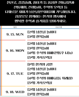 2. 남산골한옥마을[삼삼오락] 9.15(일)~ 9.18(수) 10:00~17:00