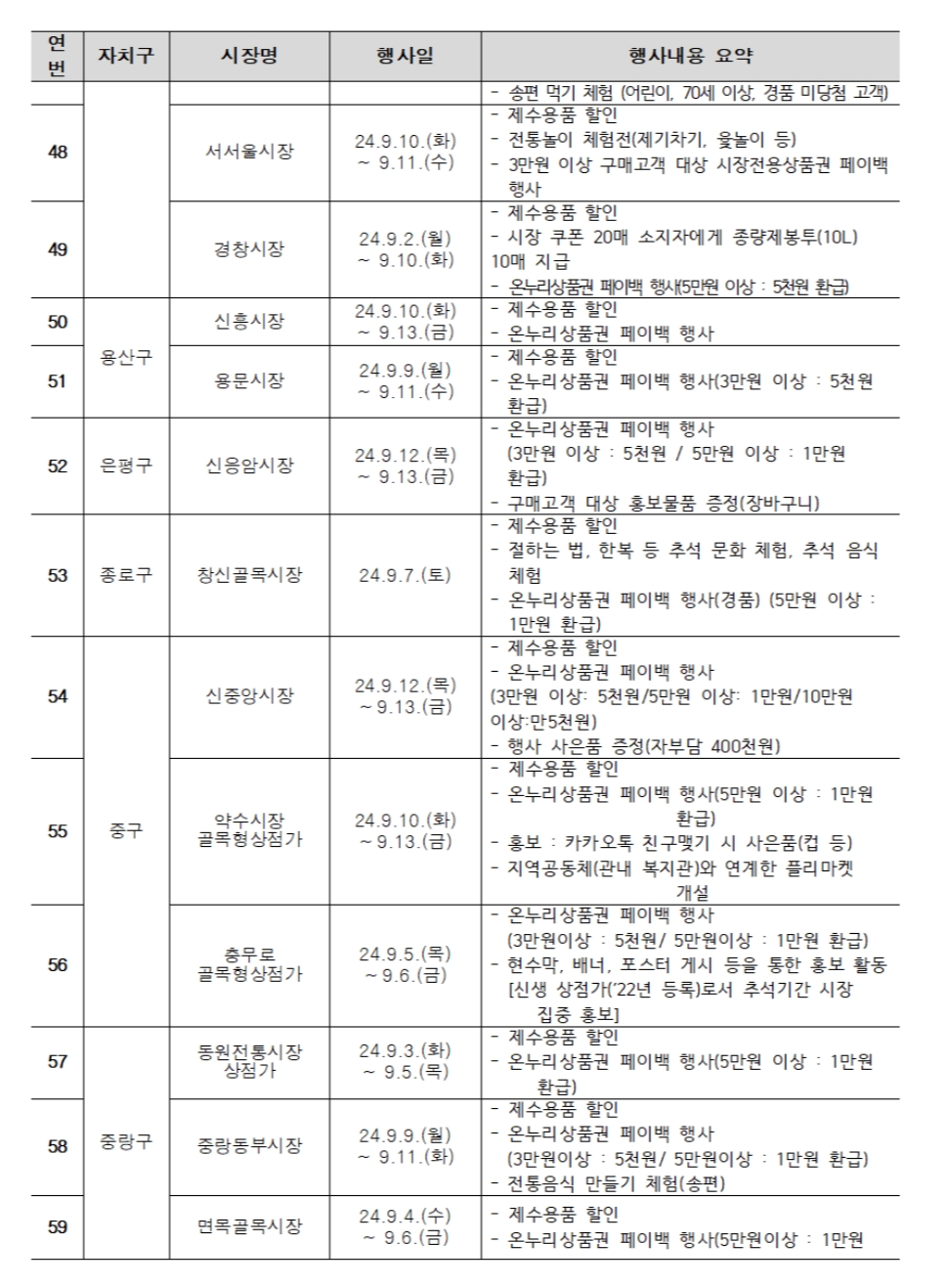 (중랑구) 동원전통시장(9.3~9.5), 중랑동부시장(9.9~9.11), 면목골목시장(9/4~9/6), 봉우시장골목형상점가(9/11~9/14)
