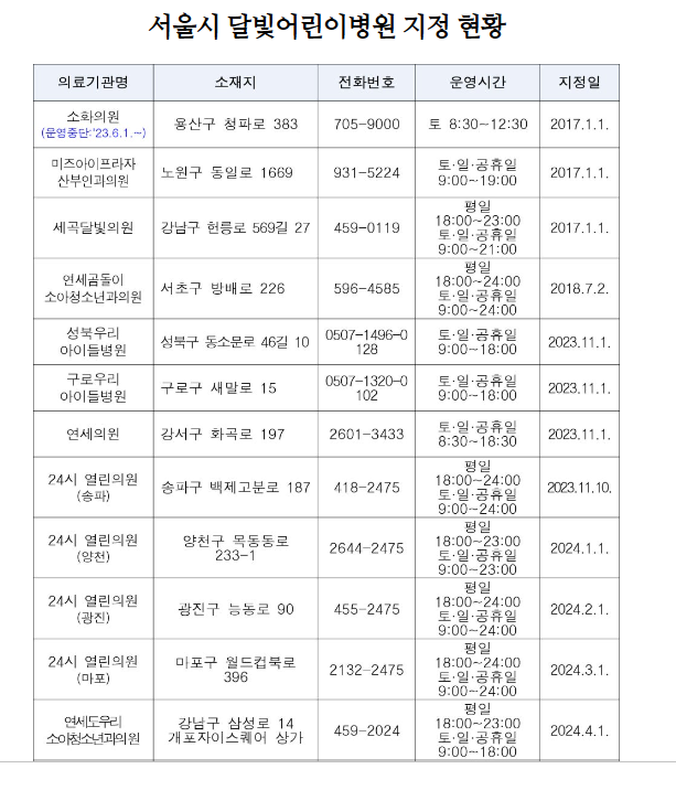 서울시 달빛어린이 병원 소재지, 전화번호, 운영시간 등을 참고하셔서 병원이용하시는데 도움이 되셨으면 좋겠습니다.
