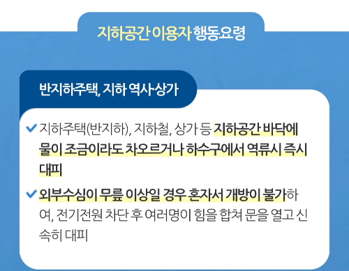 장마철 침수대비 행동요령 I 지하 주택, 지하상가, 지하주차장 침수피해 대피방법