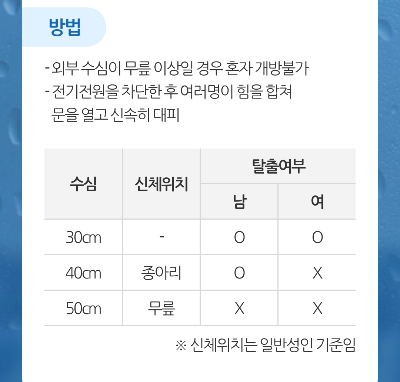 외부수심이 무릎 이상이 경우 혼자서 개방이 불가하여,전기 전원 차단후 여러 명이 힘을 합쳐 문을 열고 신속히 대피해야 합니다.