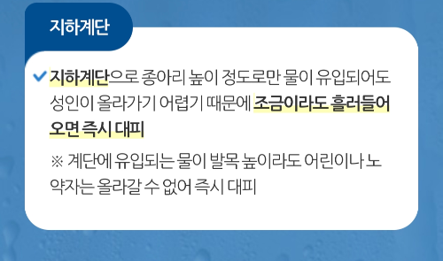 * 계단에 유입되는 물이 발목 높이라도 어린이나 노약자는올라갈 수 없어서 즉시 대피가 필요합니다.