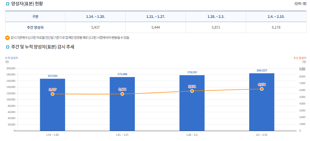 2월 15일자 질변관리청이 공개한 코로나19 양성자 표본검시 현황을 보면 2월 1주(4~10일) 코로나19 확진자수 6,178명으로 12월 마지막주 5817명으로 전주 대비해서 5.2% 코로나 19는 증가세를 보이고 있습니다.