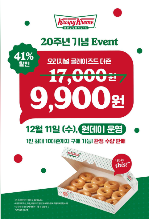 크리스피크림 도넛 20주년 이벤트, 41%할인가 9900원(12/11 단하루)