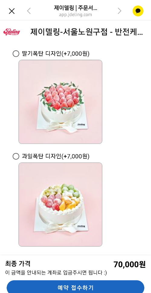 딸기 폭탄 케이크로 결정하고 예약접수를 했습니다.