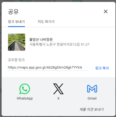 4) 공유를 클릭하면 '링크 보내기', '지도 퍼가기'가 나오는데요.