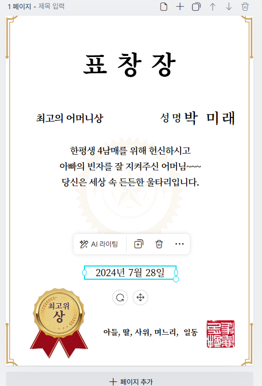 멋지게 표창장 완성해보시면 더 뿌듯하실꺼예요