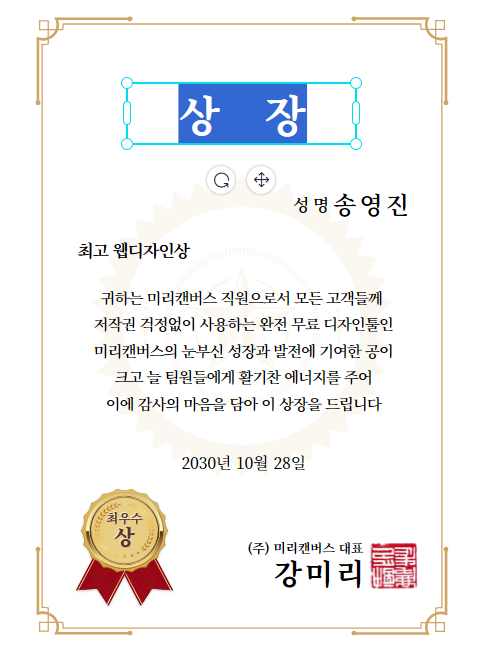 미리캔버스를 이용해서 표창장을 만들어 봤는데요.
