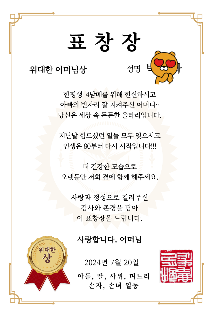 | 팔순잔치 셀프 표창장 업체에 주문하는 방법 (0) | 2024.08.05 |