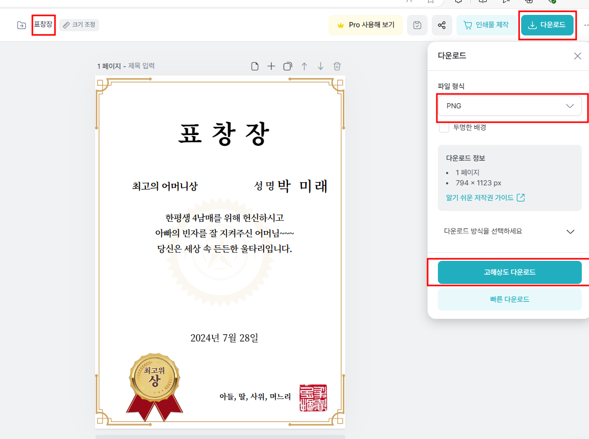 팔순잔치 엄마 표창장 상장 미리캔버스로 만드는 방법