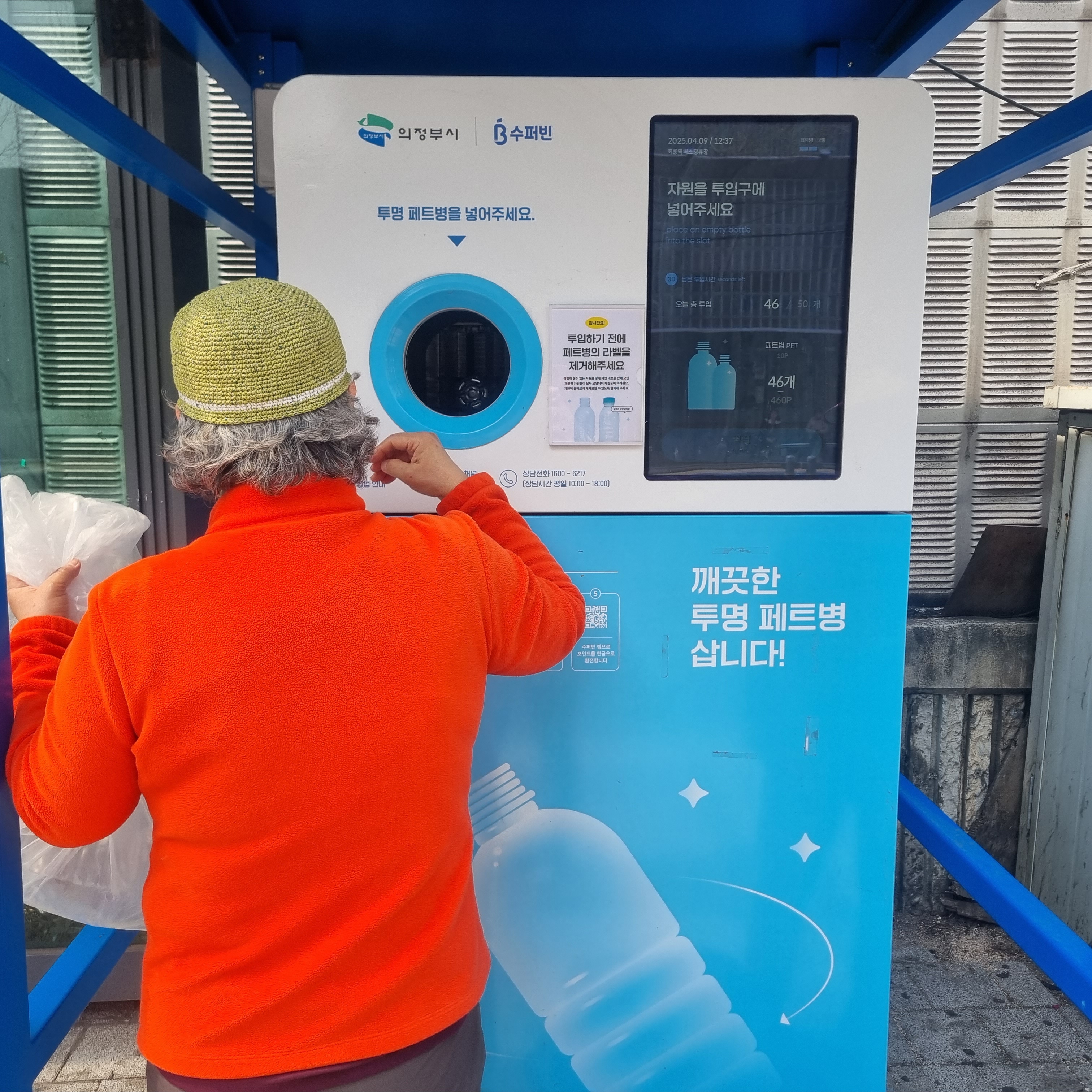 이곳은 의정부 회룡역앞 버스정류장앞에 투명 패트병이 돈이 되는 현장입니다.