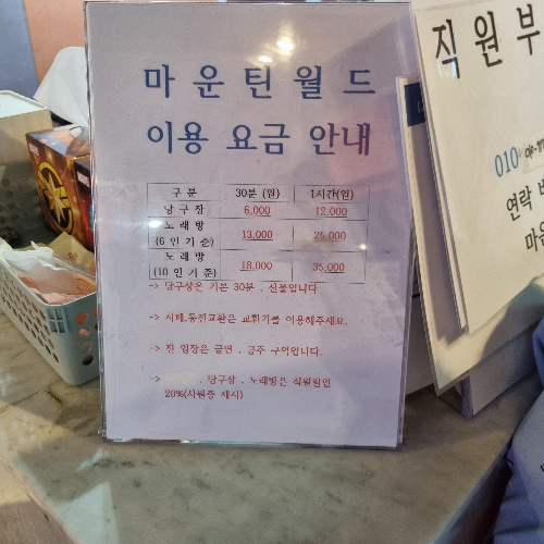 | 당구장 | 30분(6,000원) 기본 선불 1시간 (12,000원) |