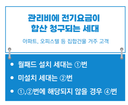 관리비에 전기요금이 합산 청구되는 아파트, 오피스텔 등 집합 건물 거주 고객에 해당이됩니다.