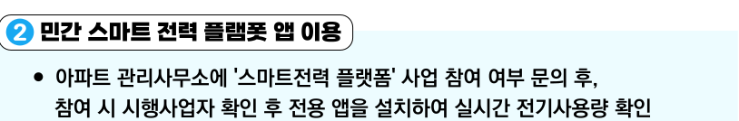 아파트 관리사무소에 '스마트전력 플랫폼'사업 참여 여부 문의후, 참여시 시행사업자 확인 후 전용 앱을 설치하면 실시간 전기 사용량을 확인할 수 있습니다.