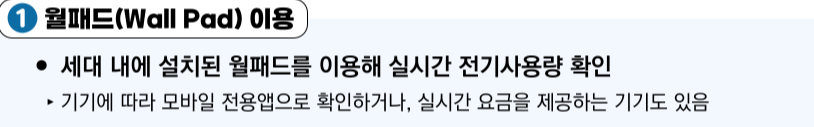 세대 내에 설치된 월패드를 이용해서 실시간 전기사용량을 확인할수 있습니다.