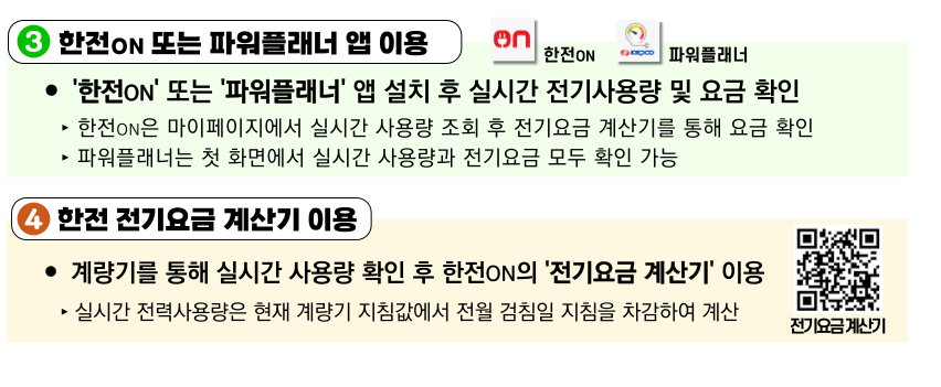 '힌전 온'또는 '파워플래너' 앱 설치 후 실시간 전기사용량 및 요금을 확인할수 있는데요