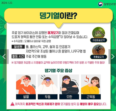 2024년 1월 12일 부터 전체 13개 공항만 국립검역소에서 입국자 중 유증상자 및 희망자 대상으로 무료 뎅기열 신속키드 검사를 실시하고 있습니다.