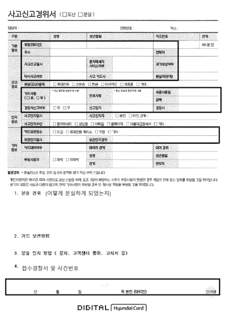 현대 카드 분실도난 카드 사고조사 접수시 관련 제출서류(카드 뒤 서명 안했을경우 보상)
