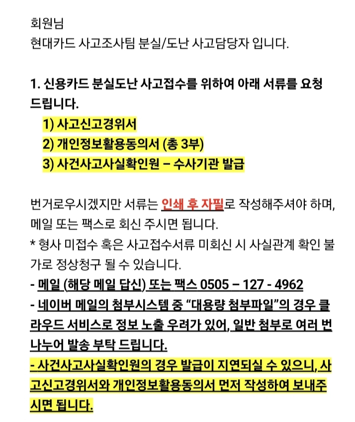 현대카드 사고조사팀 분실/도난 사고담당자께서 연락을 주고 메일로 필요양식을 알려주셨는데요.