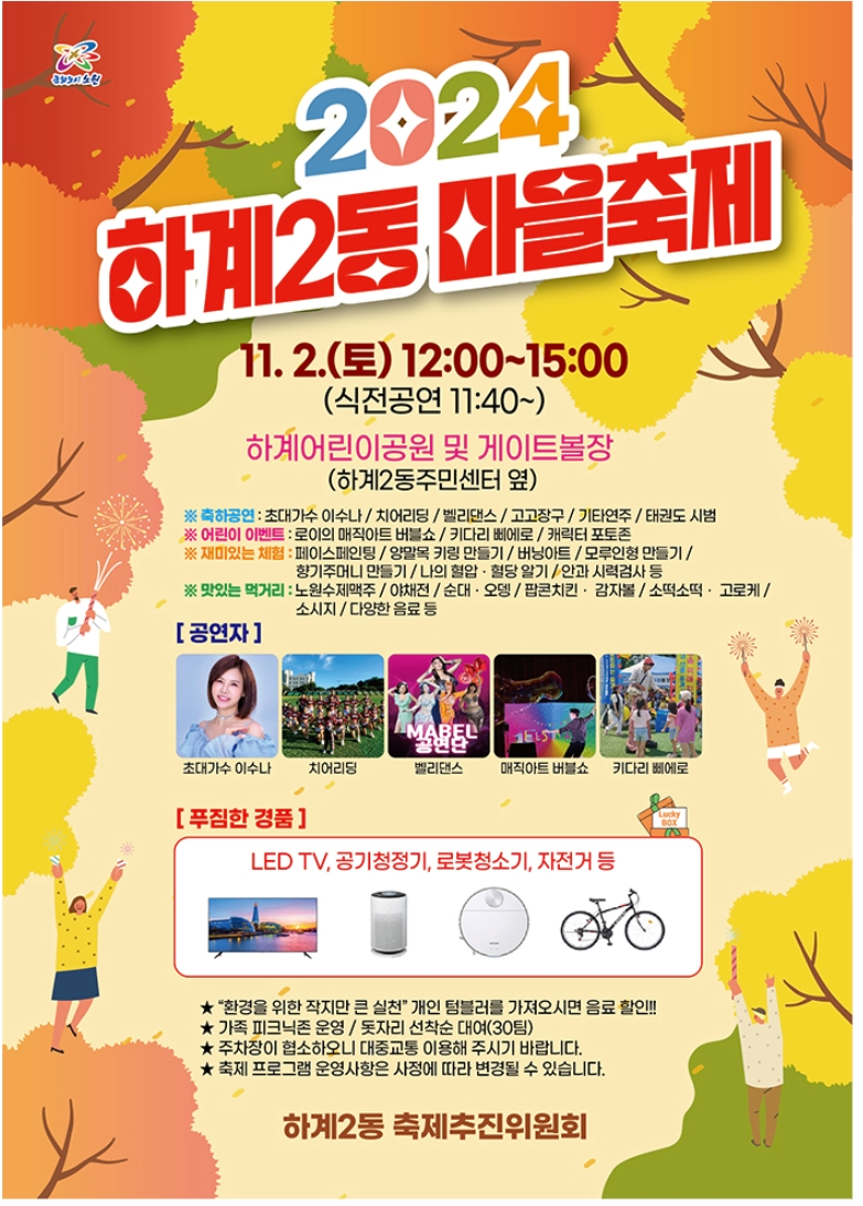 | 10월26일 노원 동 마을축제 놀러오세요(중계1동 은행골 어울림, 중계사랑뜨락축제,상계2동 원터마을문화축제, 공릉2동어울림한마당) (4) | 2024.10.24 |