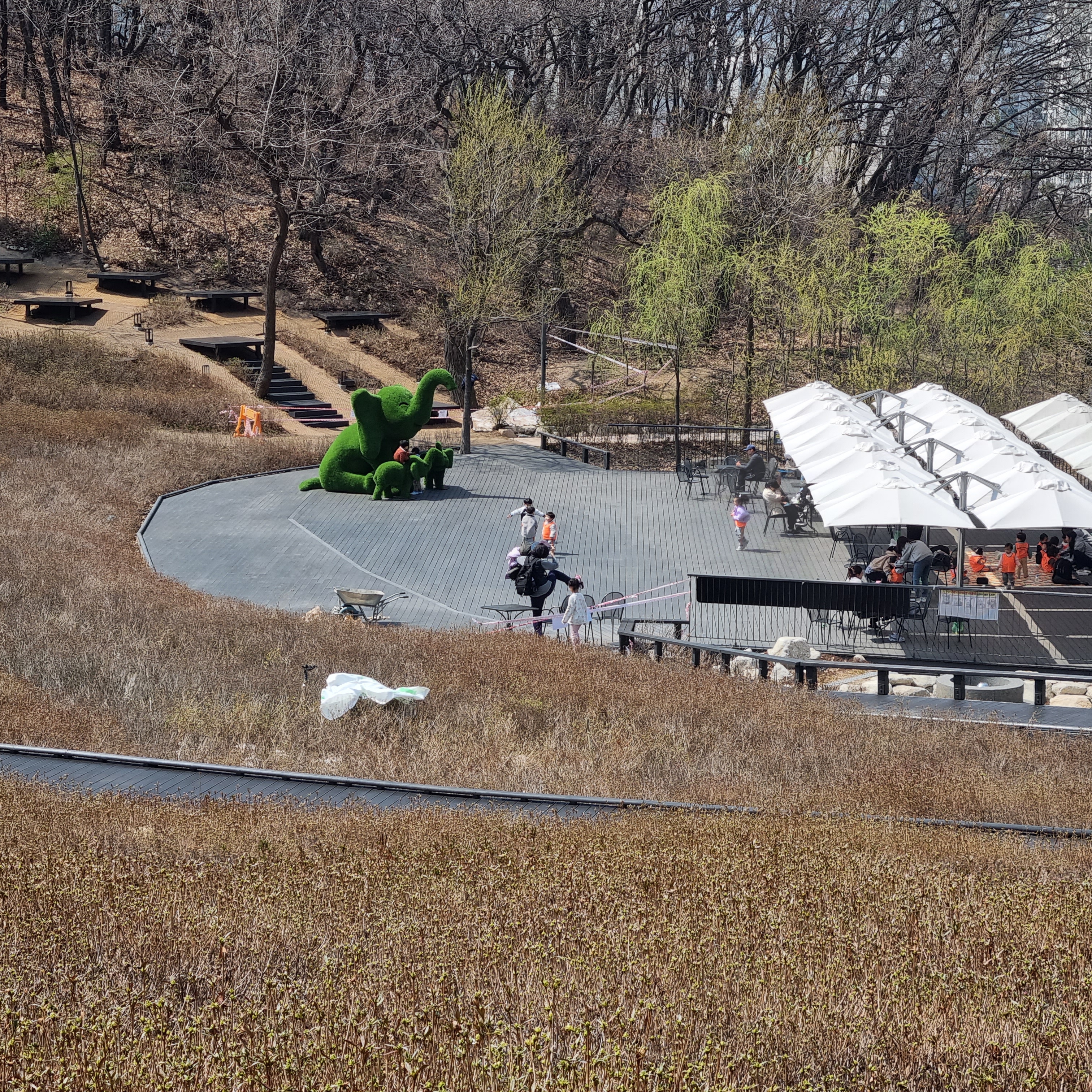잔디로 꾸며진 코끼리 세가족이 있는 곳이