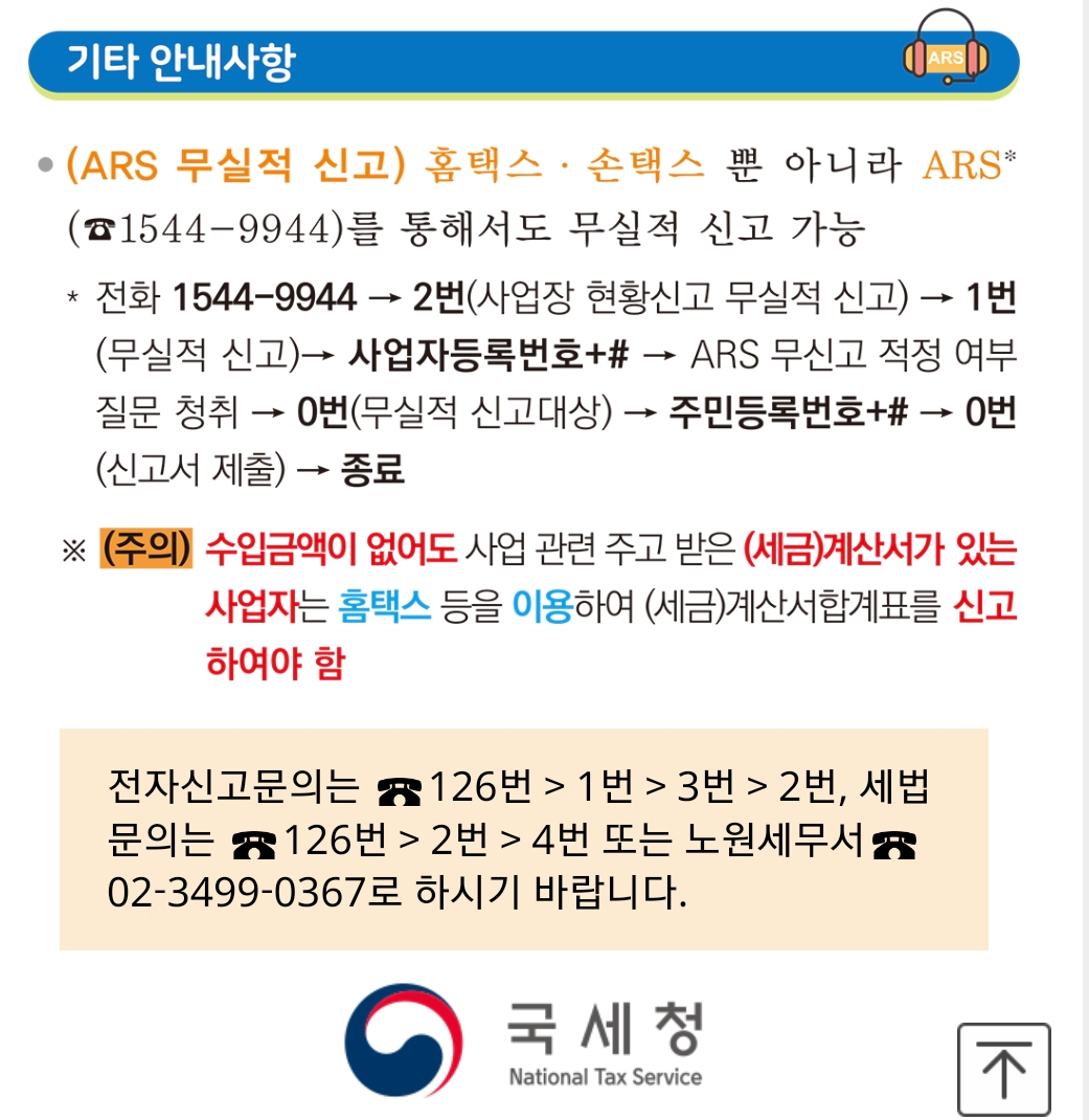 무실적 신고일 경우에는 홈텍스, 손텍스 뿐만아니라 ARS(1544-9944)를 통해서 무실적 신고 가능합니다.