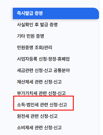 →③소득 법인세 관련 신청 신고 선택→ ④사업자 현황 신고 선택합니다