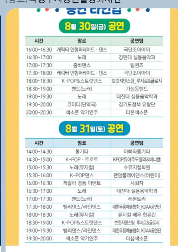 8/30, 8/31 시간대별 장르별로 공연을 참고해 주세요.