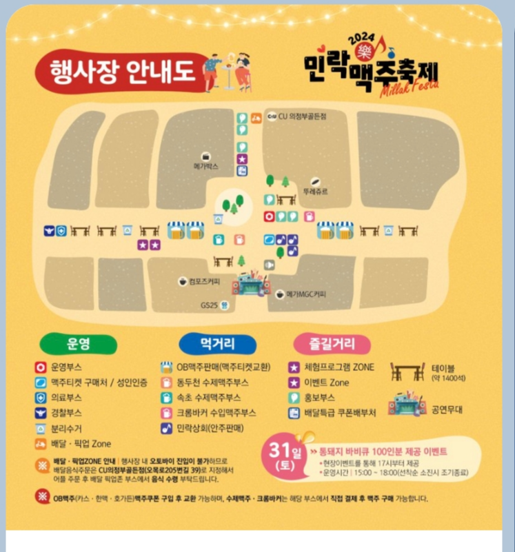 시원한생맥주와 동두천, 속초, 크롬버거 수입맥주부스, 민락상회, 체험프로그램zone, 이벤트 zone, 홍보부스, 배달특급, 쿠폰배부처 위치를 잘 참고해 보시기바랍니다.