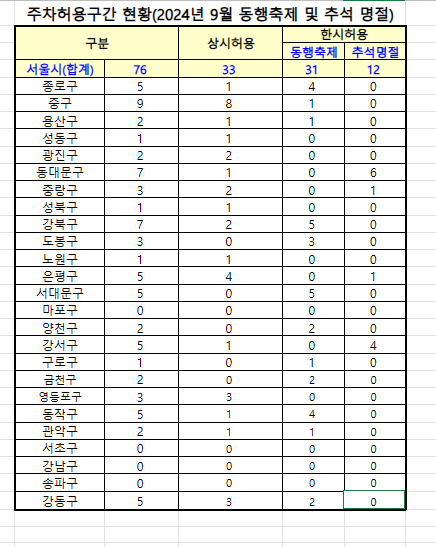 서울시 총 76곳, 상시허용 33곳, 동행축제 31곳, 추석명절 12곳입니다.