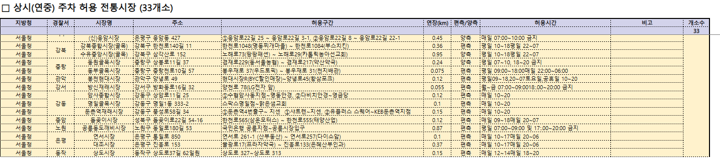 상시(연중) 주차 허용 전통시장(33개소)