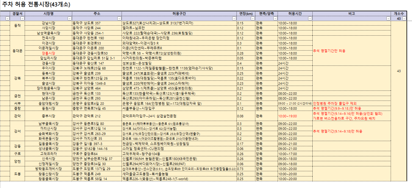 주차허용 전통시장(43개소) 안내