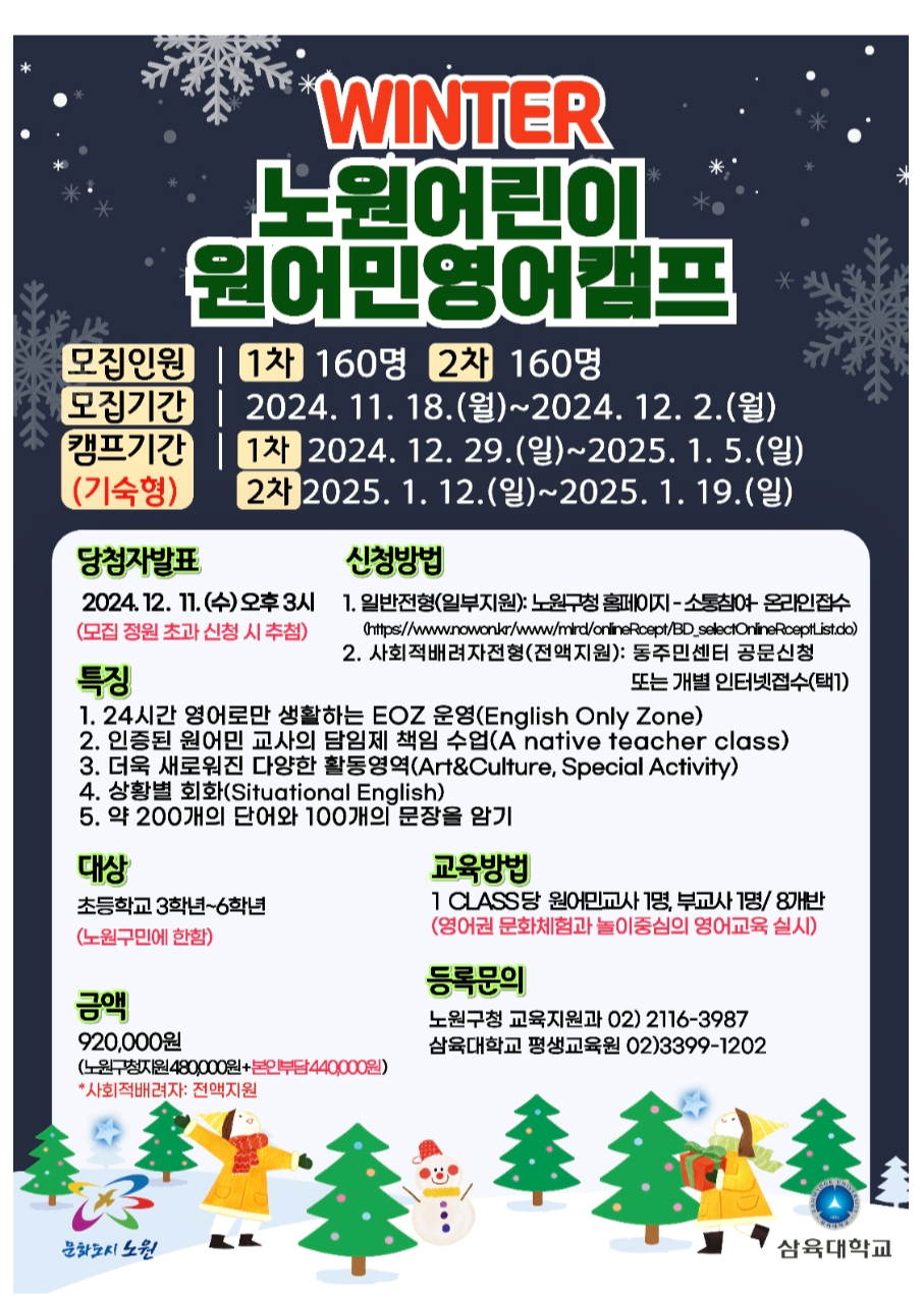 2024 winter 노원 어린이 원어민영어캠프 모집안내, 신청방법, 참가비안내