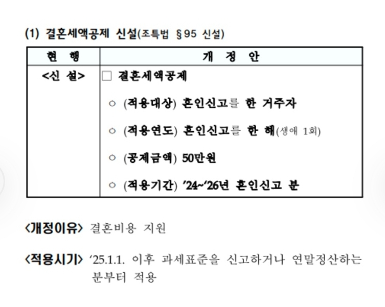 25.1.1 이후 과세표준 신고학나 연말정하는 분부터 적용을 하게 되서 25년 결혼을 앞두고 계신분이라면 신설된 결혼세액공제 혜택을 받으실수 있습니다.