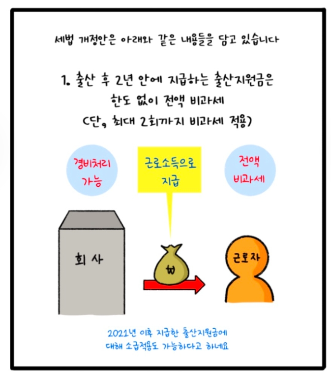 24. 1.1이후 기업으로 지급받은 출산지원금에 대해서는 과세를 하지 않게 되었습니다.
