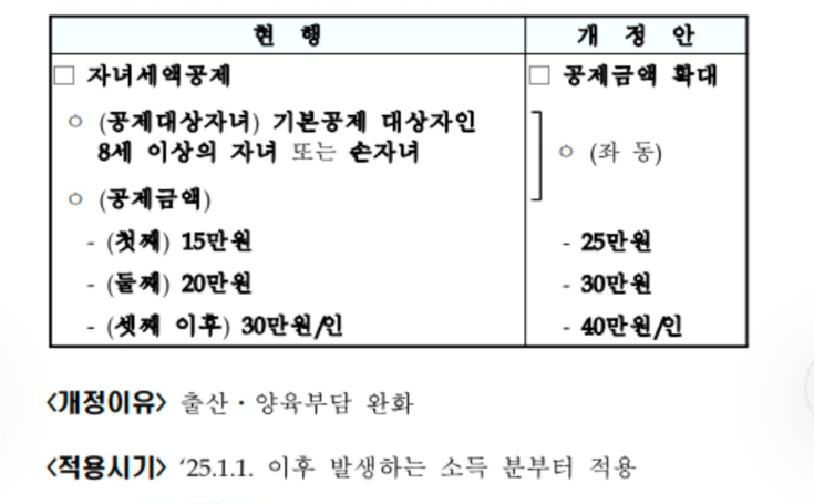 출산, 양육부담 완화를 위해서 25. 1.1 이후 발생하는 소득분부터 자녀세액 공제가 첫째는 25만원, 둘째는 30만원, 셋째이후는 40만원/인원별로 적용됩니다.
