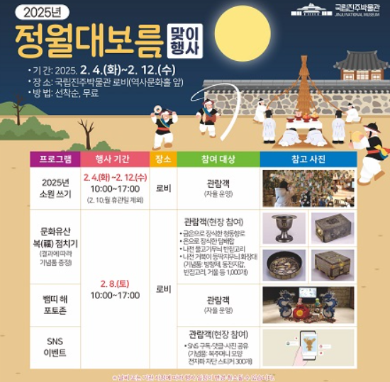 - 행사 내용 : 행운권 추첨, 전통 민속놀이, 먹거리 체험, 소원지 쓰기 등 다양한 프로그램이 진행됩니다.