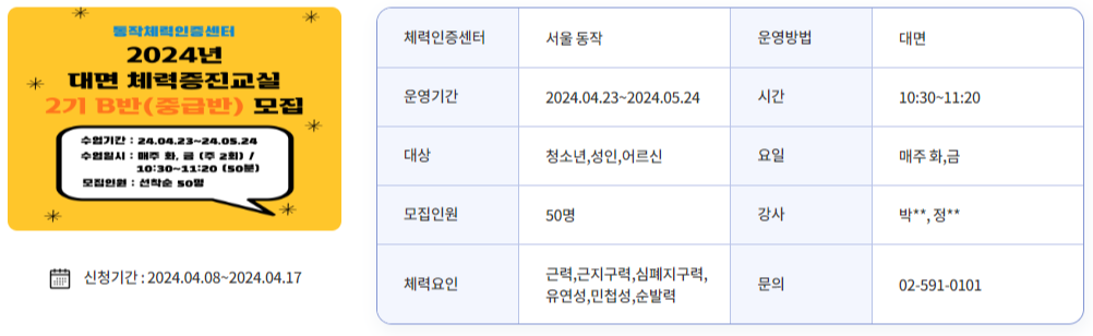 24년 동작 국민체력 100 체력증진교실 2기 B반(중급반)(개인)(~4.17 선착순 모집)