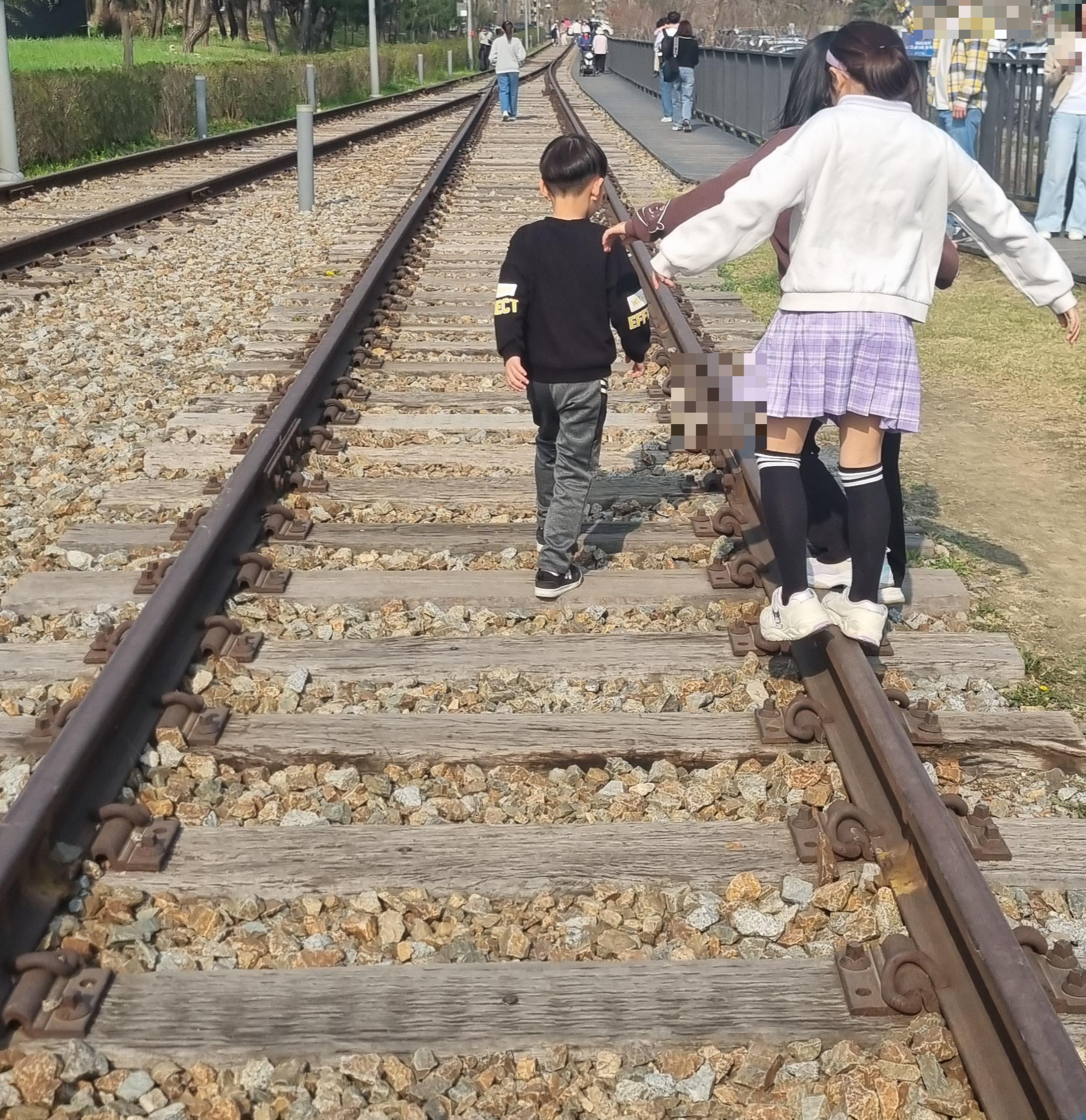 아이들은 뛰면서 철길을 걸으면서 신나하네요
